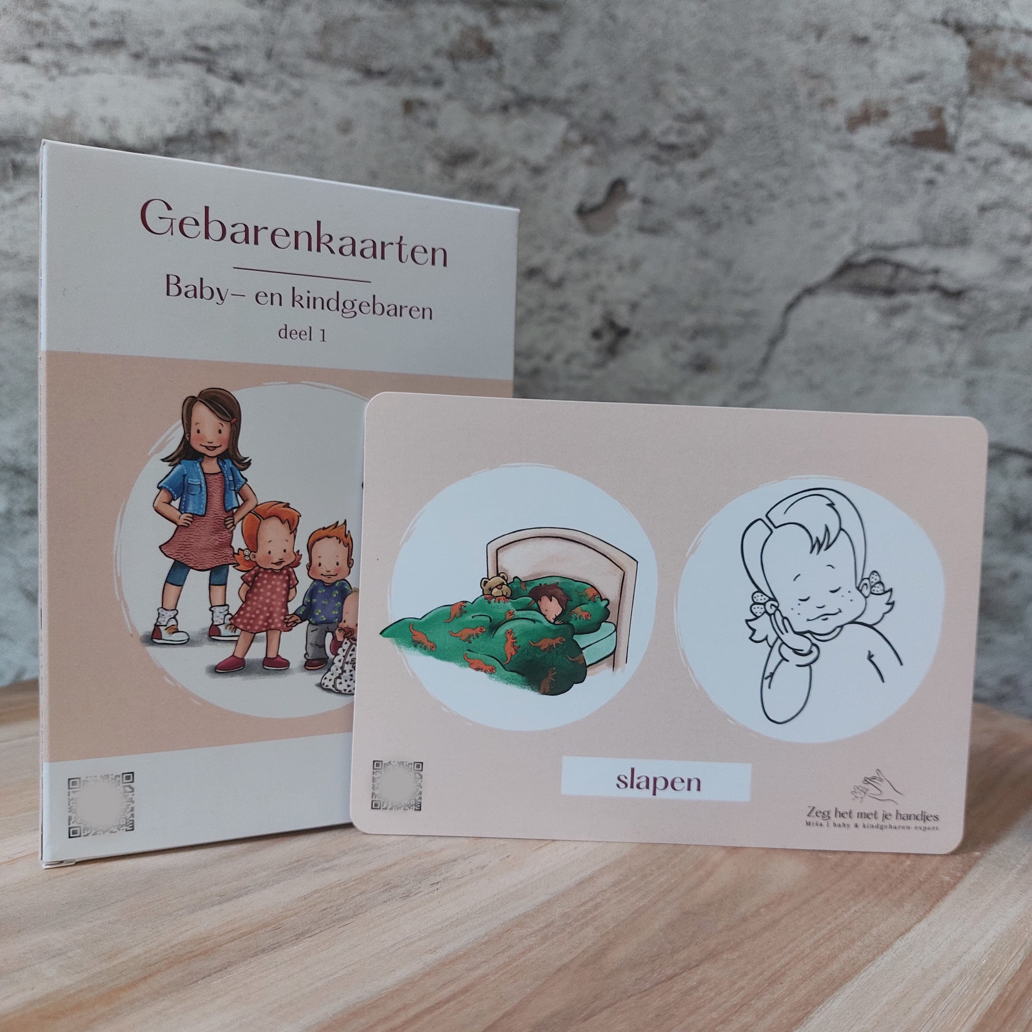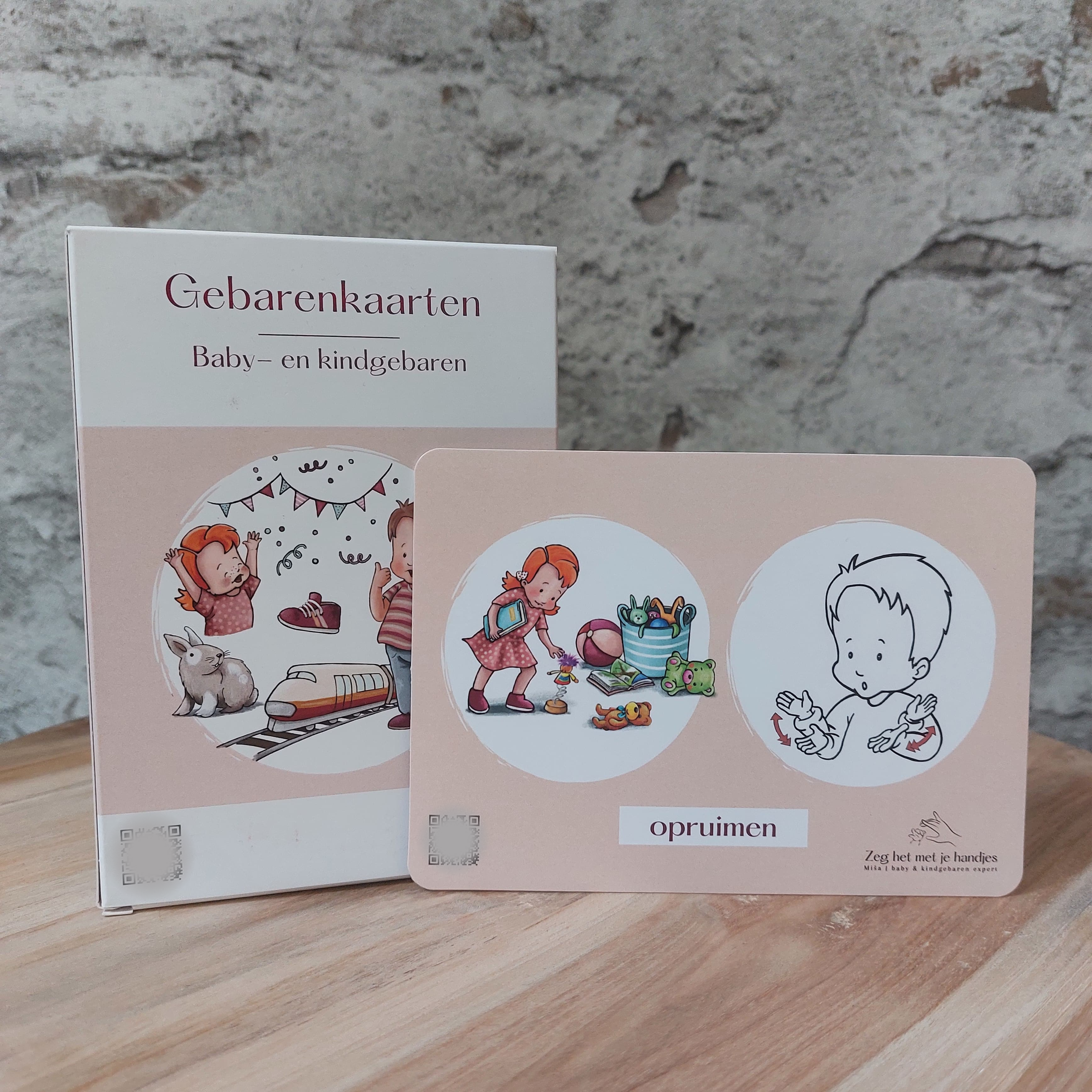 Op iedere kaart staat een QR-code die je meteen naar een kort filmpje brengt. Miลกa van Zeg het met je handjes laat je daar precies zien hoe je het gebaar uitvoert. Superduidelijk en fijn om mee te oefenen.